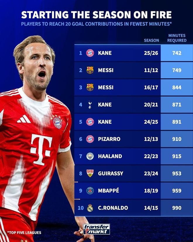 10月1日。凯恩最近打破了梅西的历史历史。这意味着俱乐部最快的赛季球员攻入20球。梅西最初是第一名。在2012赛季,他在短短749分钟内为巴塞罗那攻入了91球。十多年后,凯恩(Kane)在742分钟内为拜仁攻入20球,打破了梅西(Messi)的纪录。本赛季最佳进球中最佳进球中最好的五名球员是梅西和凯恩。梅西(Messi)和凯恩(Kane)也集中在前五个,梅西(Messi)有两个位置。其中之一是目前的第二名和上级。 2017赛季的三分之一,梅西在844分钟内攻入20球。换句话说,本赛季凯恩(Kane)和2012赛季的梅西(Messi)是历史上仅有的两名球员,在800分钟内攻入20球。第四和第五是凯恩。第四是托特纳姆热刺的凯恩,第2021季,871分钟。第五个是上个赛季,到891分钟。梅西(Messi)和凯恩(Kane)在不到900或800分钟。自第六次以来,已经过去了900分钟以上。第六至第十位是五个不同的球员,没有梅西和凯恩,所有球员都是前五名。第六是巴伐利亚披萨,2013赛季,910分钟。第七名是2023赛季在曼城的海伦兰,为915分钟。第八次是斯图加特巡回赛,2024赛季,953分钟。第九名是姆巴佩(Mbappe),他在2019赛季的959分钟内在巴黎格兰德(Paris Grande)。第十是罗纳尔多在皇家马德里的2015赛季,为990分钟。罗纳尔多在底部。