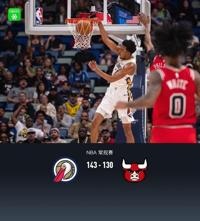 北京时间11月25日,NBA常规赛新奥尔良鹈鹕队对阵芝加哥公牛队。半场鹈鹕74-58领先公牛,半场鹈鹕143-130领先公牛。新奥尔良鹈鹕队的锡安·威廉姆森得到29分、1个篮板和2次助攻,萨迪克·贝得到20分、14个篮板和3次助攻。芝加哥公牛队的多孙姆得到28分、2个篮板和1次助攻,科比·怀特得到24分、5个篮板和6次助攻。第一节,鹈鹕队的阿尔瓦拉多得到8分,公牛队的杰文卡特得到9分。首节结束,鹈鹕37-30领先公牛。第二节,鹈鹕队的锡安威廉姆森得到14分,公牛队的贾伦史密斯得到6分。半场结束,鹈鹕74-58领先公牛。第三节,鹈鹕队的菲尔斯拿下7分,公牛队的科比怀特拿下11分。最终第三节,鹈鹕108-93领先公牛。第四节,鹈鹕队的萨沙迪克贝得到14分,公牛队的多孙穆得到10分。最终,鹈鹕队以143-130击败公牛队。完整的游戏数据。新奥尔良鹈鹕队的锡安·威廉姆森得到29分、1个篮板、2次助攻、2次抢断和1次投篮。萨迪克·贝得到20分、14个篮板、3次助攻和2次抢断,特雷·墨菲得到20分、4个篮板、4次助攻和2次抢断。芝加哥公牛队方面,多孙穆28分2篮板1助攻,科比怀特24分5篮板6助攻,约什圭迪21分7篮板6助攻。新奥尔良鹈鹕队首发阵容:锡安·威廉姆森、萨迪克·贝、特雷·墨菲、菲尔斯、德里克·奎因。芝加哥公牛队:Dosunmu、科比·怀特、乔什·吉迪、布泽利斯、帕特里克·威廉姆斯。