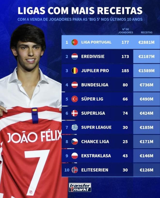 近日,德国一家转会市场网站公布“过去10年排名前五的联赛转会费”数据发现,葡超以总销售额288.1万欧元、人均转会价格1628万欧元位居榜首,其次是荷甲和比利时。数据截至北京时间2025年10月1日,来源:德国转会市场。葡萄牙联赛出售球员数量:177 出售总金额:28.81亿欧元 每名球员价格:1628万欧元 最受欢迎球员: 菲利克斯:本菲卡→马德里竞技,1.272亿欧元 费尔南德斯:本菲卡→切尔西,1.21亿欧元 努内斯:本菲卡→利物浦,8500万欧元 天数:本菲卡→曼彻斯特 曼城,7160万欧元 出售荷甲球员数量:173人 出售总金额:21.87亿欧元 人均价格:1264万欧元 最受欢迎球员:安东尼:阿贾克斯→曼联,9500万欧元 德容:阿贾克斯→巴塞罗那,8600万欧元 德利赫特:阿贾克斯→尤文entus,8550万欧元 马丁内斯:阿贾克斯→曼联,5737万欧元 出售尤皮勒职业联赛球员数量:185人 总销售额:15.89亿欧元 球员身价:859万欧元 高价值球员:德克特拉莱:布鲁日→AC米兰,3750万欧元 大卫:根特→里尔,2700万欧元蒂勒曼斯:安德莱赫特 → 摩纳哥,2500万欧元(奥地利甲级联赛) 出售球员数量:80 总销售额:7.36亿欧元 每人价格:920万欧元 高球员价格:哈兰德:萨尔茨堡红牛→多特蒙德,2000万欧元 达卡:萨尔茨堡红牛→莱斯特城,3000万欧元 凯塔:萨尔茨堡红牛→RB莱比锡,29.75百万欧元 Mwep:萨尔茨堡红牛→布莱顿,2300万欧元沙博斯莱:萨尔茨堡红牛→RB莱比锡,2000万欧元土耳其超级联赛出售球员:66名总销售金额:4.9亿欧元每名球员价格:742万欧元高价球员:古勒:费内巴切→皇家马德里,2400万欧元托松:贝西克塔斯→埃弗顿,2250万欧元 金珉载:费内巴切→那不勒斯,1900万欧元 丹麦超级联赛出售球员数量:74人 出售总额:4.24亿欧元 每人价格:573万欧元 高价球员:哈德森:哥本哈根→里尔,1700万欧元 文德:哥本哈根→沃尔夫斯堡,1200万欧元 达姆斯高:新西兰→ 桑普多利亚,675万欧元 希腊超级联赛 出售球员数量:30 总销售额:1.85亿欧元 每人价格:617万欧元 高价球员:波登塞:奥林匹亚科斯→狼队,1960万欧元 Letsos:奥林匹亚科斯→勒沃库森,1750万欧元 SA:奥林匹亚科斯→狼队,800万欧元 捷克联赛(捷克第一 分区) 出售球员数量:25 总出售金额:1.71亿欧元 人均价格:684万欧元 高价球员: 苏切克:布拉格斯拉维亚→西汉姆联,1620万欧元 赫罗泽克:布拉格斯拉维亚→勒沃库森,1300万欧元 曹法:布拉格斯拉维亚→西汉姆联,600万欧元 E区出售球员kstraklasa:43 总销售额:1.46亿欧元 人均价格:340万欧元 高价球员: 型号:莱赫波兹南→布莱顿,1100万欧元 Majecki:莱吉亚华沙→摩纳哥,700万欧元 贝德纳雷克:莱赫波兹南→南安普顿,600万欧元 挪威超级联赛(精英)出售的球员:30名球员 出售总额: 1.26亿欧元 人均价格:420万欧元 高价球员:米克尔:林→切尔西,2000万欧元 厄德高:斯特罗加斯特→皇马,400万欧元 豪格:博德闪亮→AC米兰,4.8万欧元