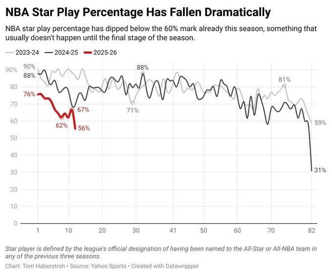 北京时间今日,NBA记者汤姆·哈伯斯特罗(Tom Haberstroh)发表文章,将本赛季NBA球星因伤缺席的情况与过去两个赛季进行了对比。结果并不乐观。本赛季到目前为止,NBA球星的出勤率仅为56%。与上赛季相比,这个上座率直到赛季末才出现。去年的23-24赛季是整个赛季参与率最低的,为59%。到目前为止,这位NBA球星已经缺席了200场比赛,是23-24赛季同期的两倍。根据统计标准,如果一名球员在过去三个赛季入选全明星或最佳阵容,那么他就被视为明星。哈伯斯特罗还整理了本赛季迄今为止明星球员的伤病名单。今天将缺席的球星 Victor Bingbang Yamaja Morant Paul Banquillo Trae Young Jayson Tatum Damian Lillard 今天缺席的球星 Jrue Holiday TBA: 勒布朗·詹姆斯(已确认) 凯德·坎宁安(已确认) 其他著名缺席球员: 斯蒂芬·卡斯尔 狄龙·哈珀 杰伦·格林斯科特-亨德森 卡梅伦-托马斯·沃克-凯斯勒 乔纳森·库明加